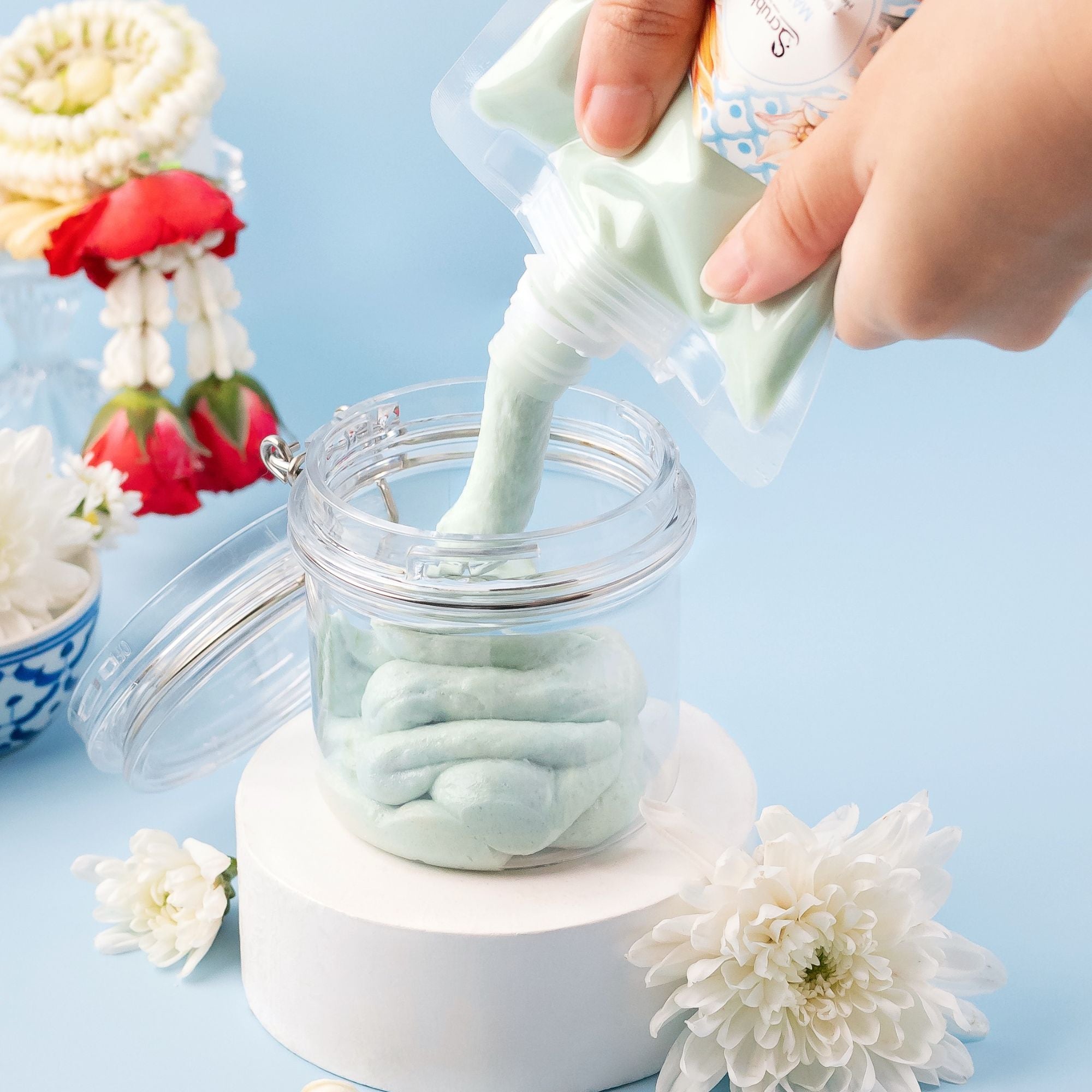 Twist the cap to open. Pour and squeeze the content from this pouch into your Scrubbit jar.